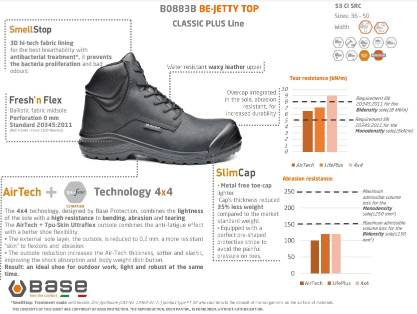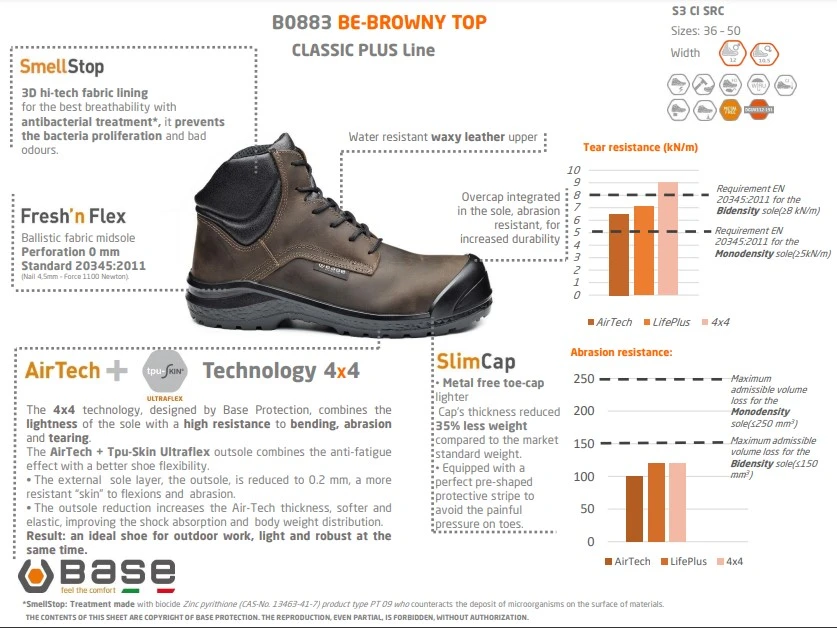 - SlimCapin ja muiden teknologioiden avulla Base Protection turvajalkineet ovat tavallista keveämmät, turvallisuudesta tinkimättä.