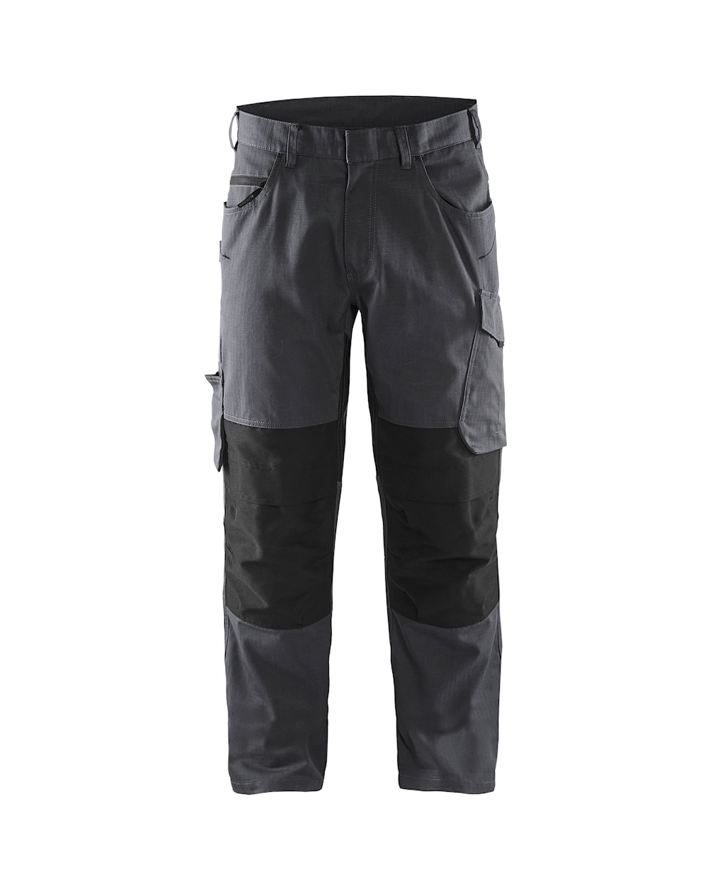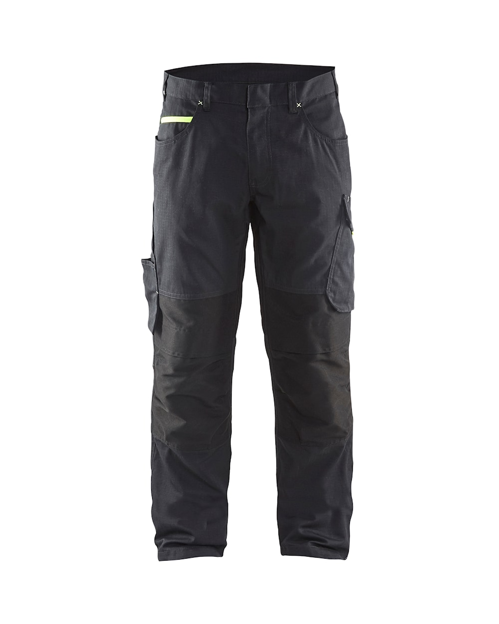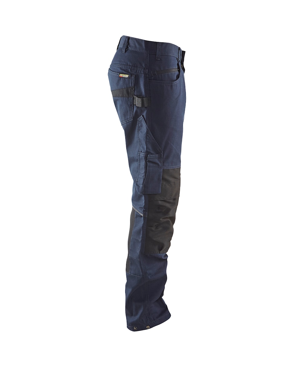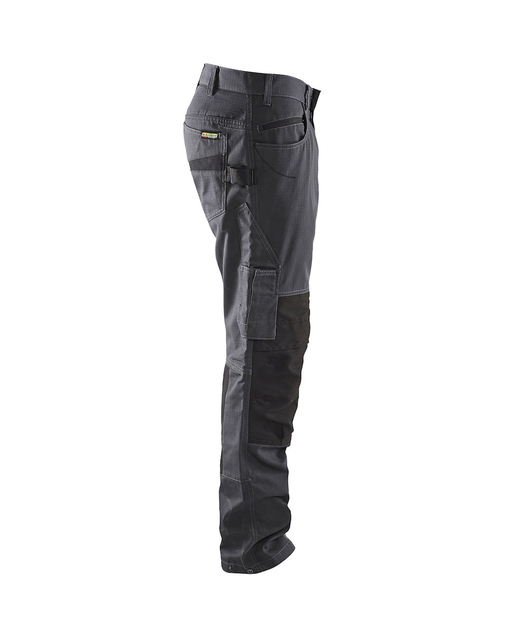 Kestävät ja toiminnalliset ripstop kankaiset Blåkläder joustohousut. Istuvuutta ja mukavuutta varten housuissa on joustavat kangasosiot pohkeissa ja reisien sisäosissa. CORDURA®-stretch polvisuojataskut, joihin polvisuojat asetetaan yläpuolelta. Fiksuja yksityiskohtia kuten pienet heijastimet, verkkokankainen puhelintasku, mittatasku ja käytännöllinen puukon pidike.