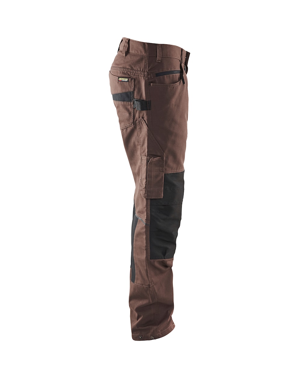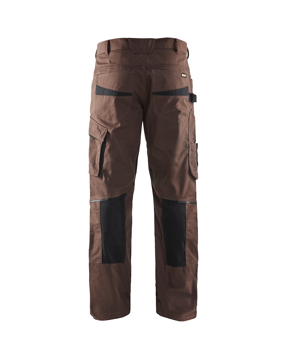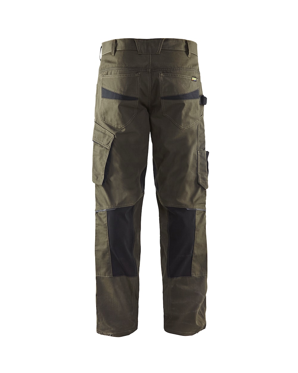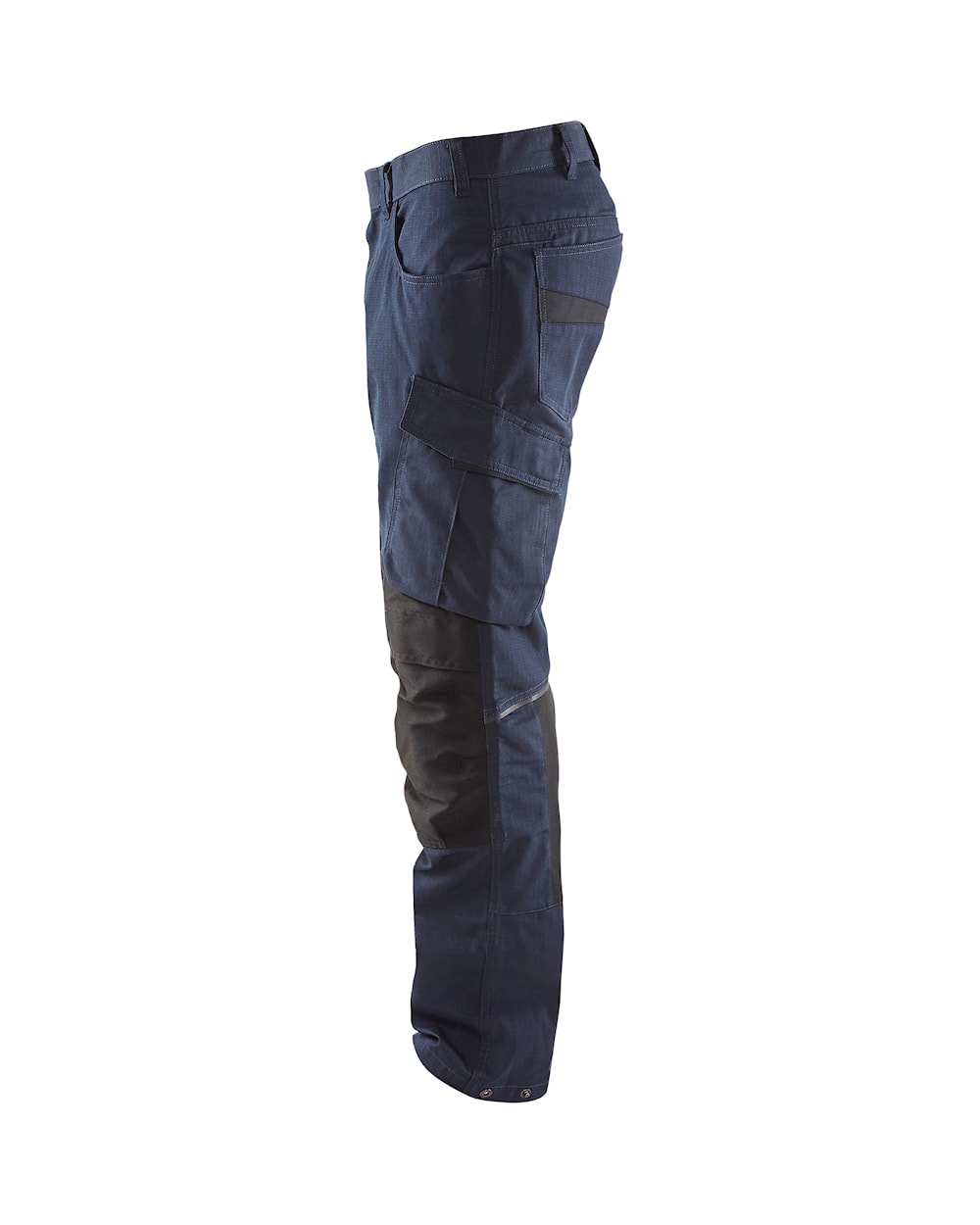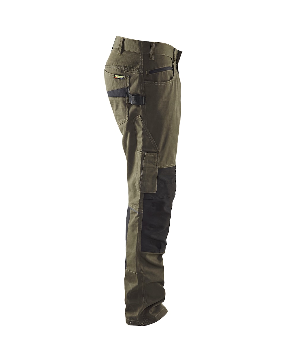 Kestävät ja toiminnalliset ripstop kankaiset Blåkläder joustohousut. Istuvuutta ja mukavuutta varten housuissa on joustavat kangasosiot pohkeissa ja reisien sisäosissa. CORDURA®-stretch polvisuojataskut, joihin polvisuojat asetetaan yläpuolelta. Fiksuja yksityiskohtia kuten pienet heijastimet, verkkokankainen puhelintasku, mittatasku ja käytännöllinen puukon pidike.