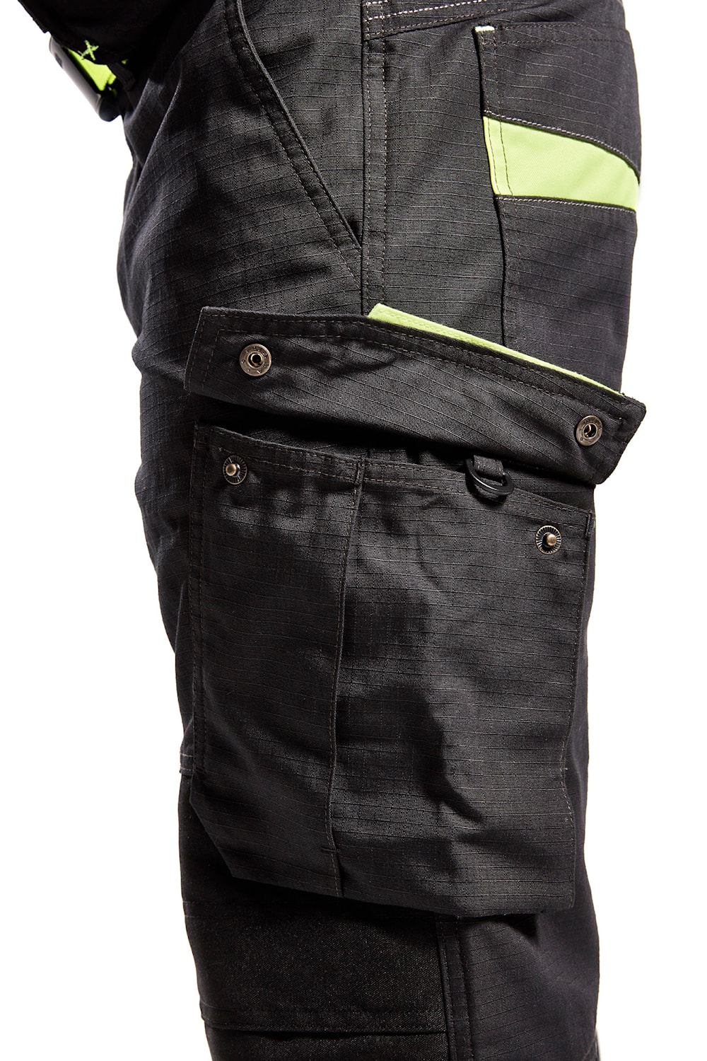 Joustavaa kangasta haaroissa, pohkeissa ja polvisuojataskuissa