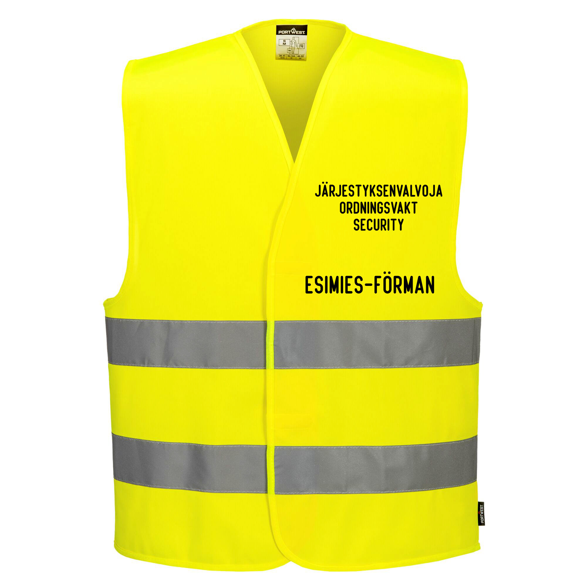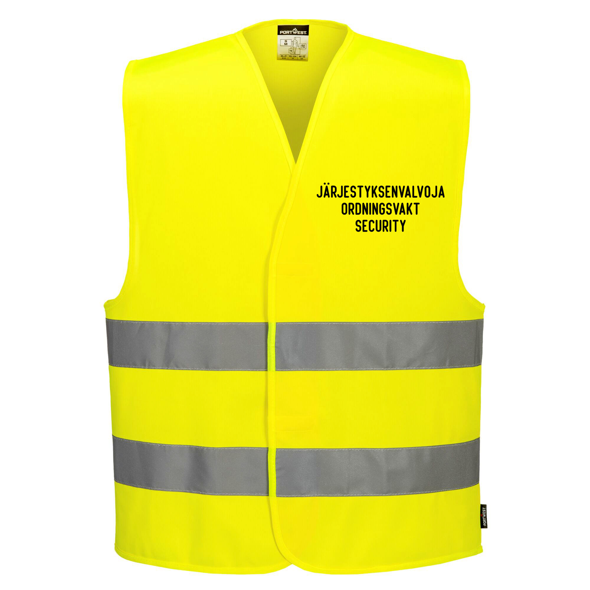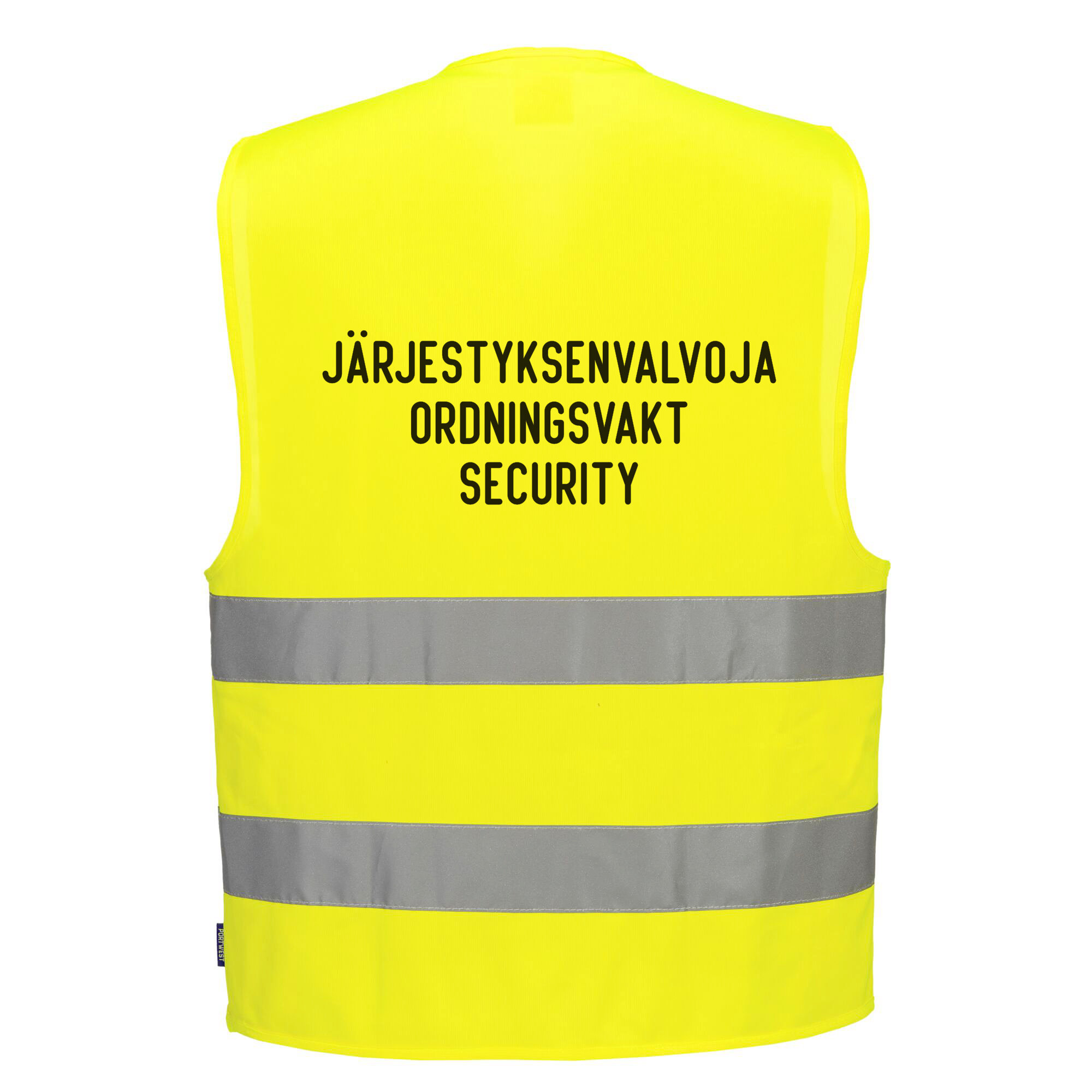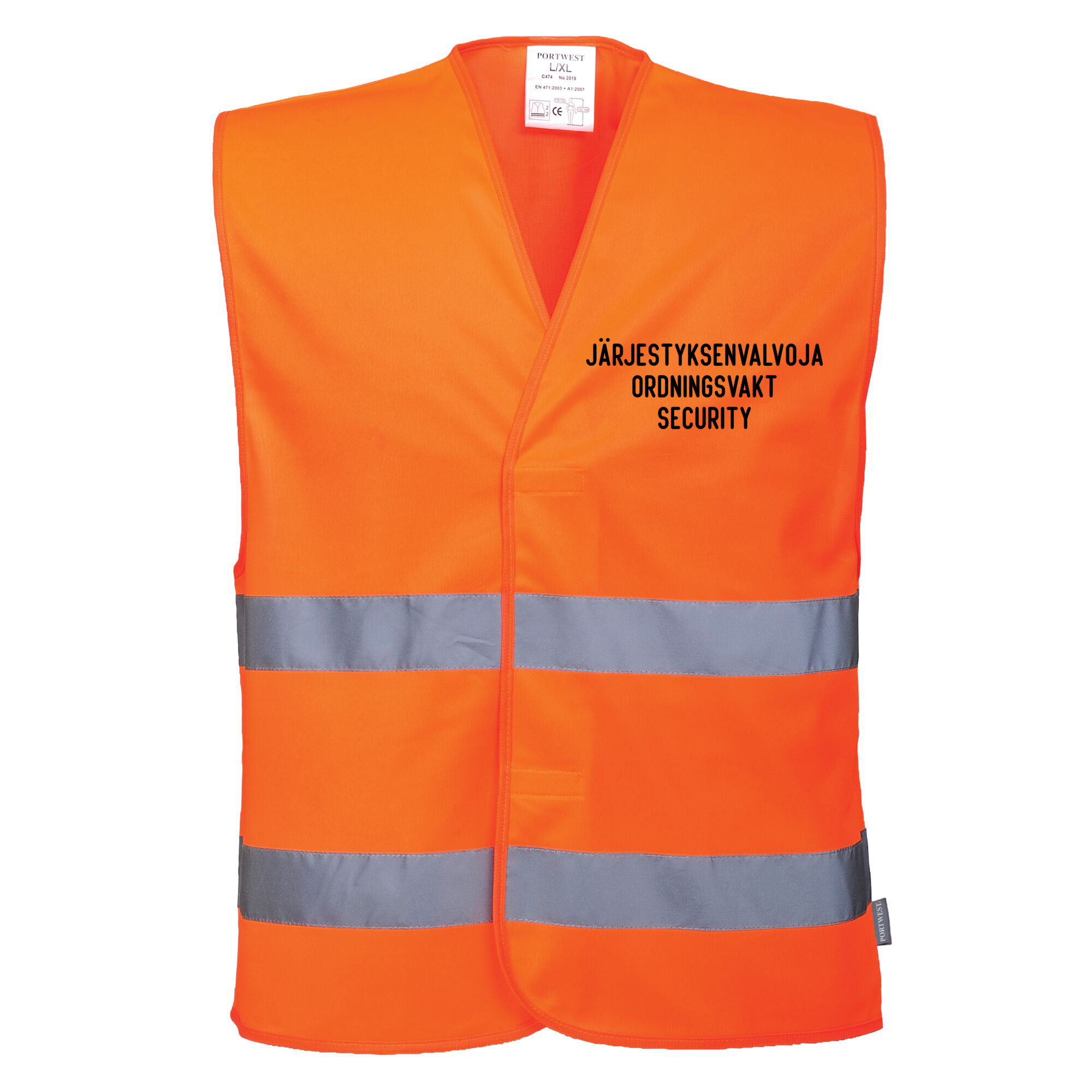 Järjestyksenvalvoja liivi takaa näkyvyyden ja turvallisuuden kaikissa tapahtumissa. Huomiokeltaiseen tai oranssiseen liiviin on painettu kestävät ”JÄRJESTYKSENVALVOJA”, ”ORDNINGSVAKT” ja ”SECURITY”-tekstit selkään ja rintaan, jotka varmistavat selkeän tunnistettavuuden. Liiviin on mahdollista saada myös valinnaiset ”ESIMIES – FÖRMAN” -painatukset.