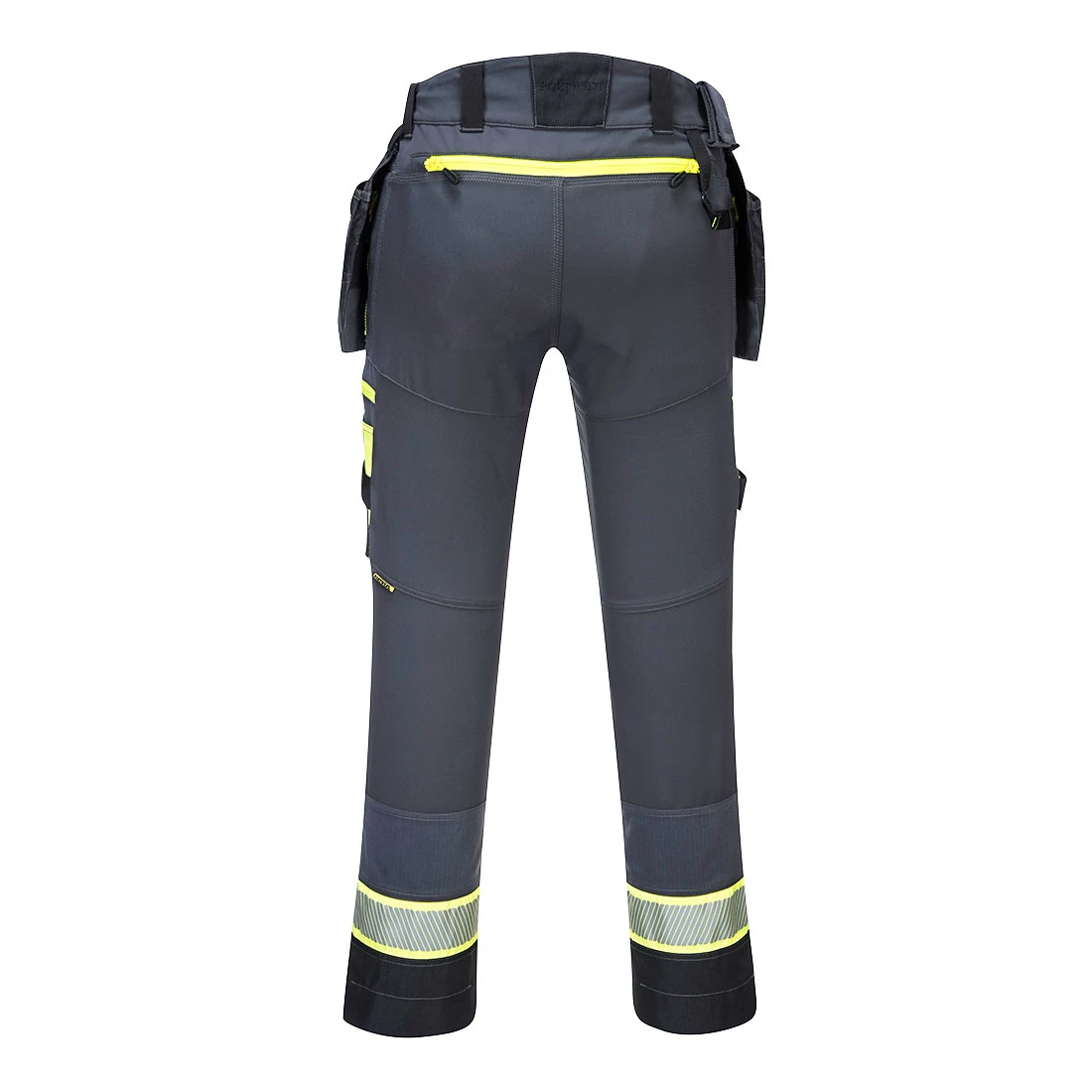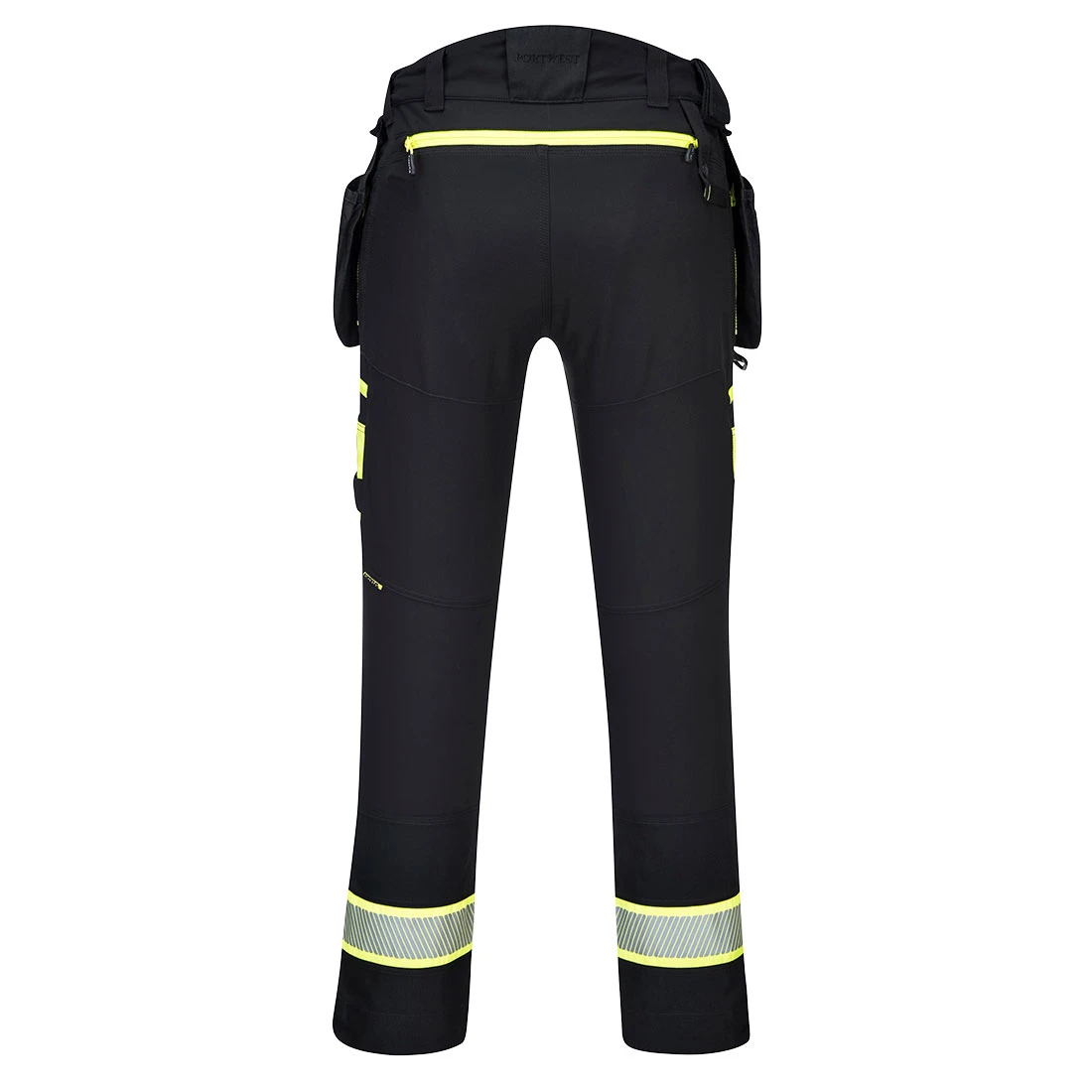 Ergonomisen istuvaksi suunnitellut DX4 työhousut irrotettavilla riipputaskuilla on valmistettu neljään suuntaan joustavasta kankaasta. Housuissa on takaa korotettu vyötärölinja, jossa on joustavat sivut, mikä takaa suojan ja mukavuuden kaikissa työasennoissa. Esitaivutetut ylhäältä täytettävät polvisuojataskut, reilun kokoiset etutaskut ja vetoketjullisia säilytystaskuja. Kolminkertaisesti ommellut saumat lisäävät kestävyyttä