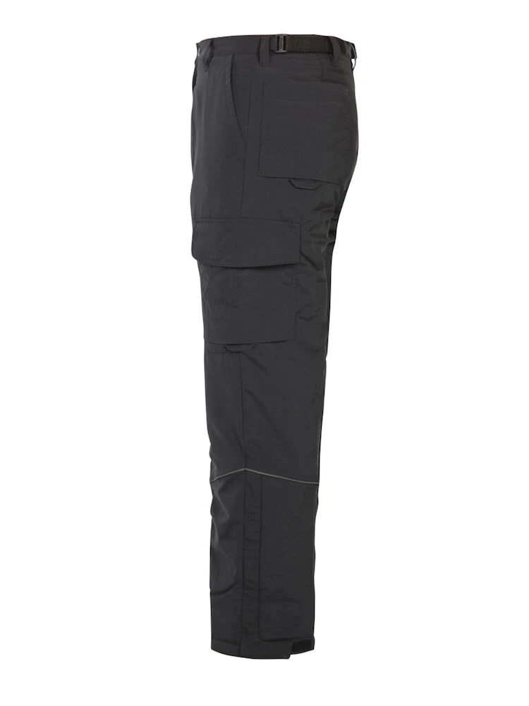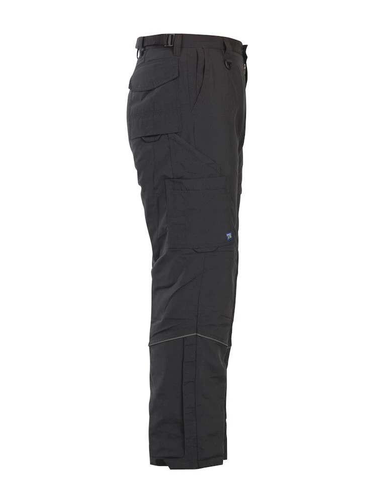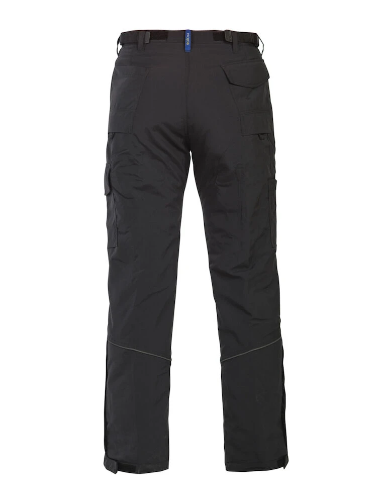 Toppavuorilliset housut, jossa on sivu-, taka- ja reisitaskut. Kaksi tilavaa reisitaskua, joista oikeanpuoleisessa paikat kynille, paperille ja mitalle ja vasemmanpuoleisessa paikka puhelimelle. Housuissa on säädettävä vyötärö ja sisäpuoliset polvisuojataskut. Heijastavat yksityskohdat lahkeissa.