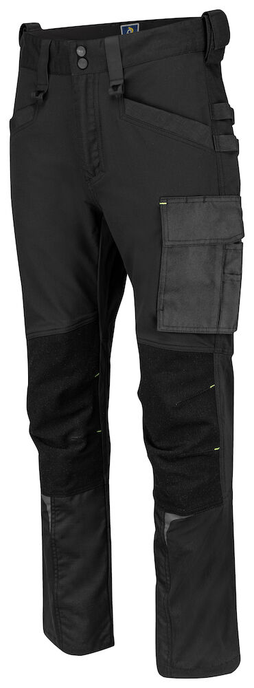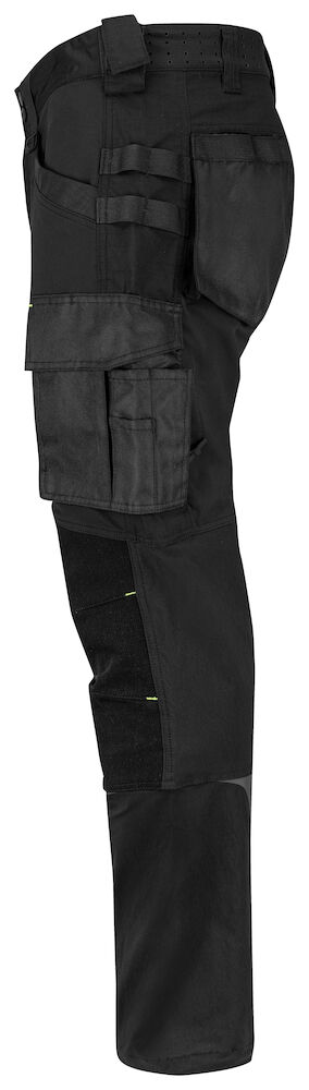 Joustavat työhousut mahdollistavat hyvän liikkuvuuden ja tuntuvat mukavilta päällä. Moderni leikkaus. Neljään suuntaan joustavaa materiaalia reisissä ja takamuksessa. Kahteen suuntaan joustavaa materiaalia polvitaipeissa ja lahkeiden alaosassa. Sivuissa vetoketjulliset tuuletusaukot. Myös vyötäröllä tuuletusaukko. Housuissa on reisitaskut, vasemmalla tasku työkaluille ja kynille, puhelintasku, jossa tarrakiinnitys, ja ID-korttipidike. Oikealla mittatasku ja puukkotasku, jossa puukkonappi. Mahdollisuus kiinnittää MOLLE-järjestelmä molemmille sivuille. Mahdollista myös lisätä vasarelenkin tarrakiinnityksellä. Heijastavia yksityiskohtia. Säädettävät lahkeensuut. Muotoillut polvet. Sisäpuolella polvisuojataskut, jotka voidaan säätää kahdelle eri korkeudelle. Riipputaskuissa ja lahkeissa Cordura®-vahvikkeet ja polvissa joustavat kevlar-vahvikkeet, jotka lisäävät housujen kestävyyttä ja mukavuutta.