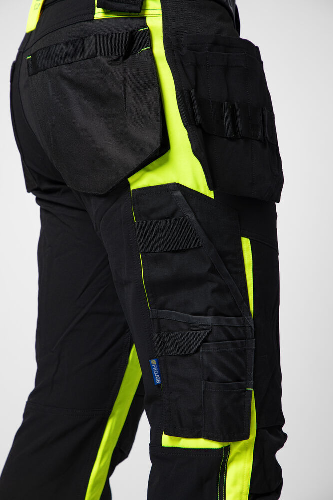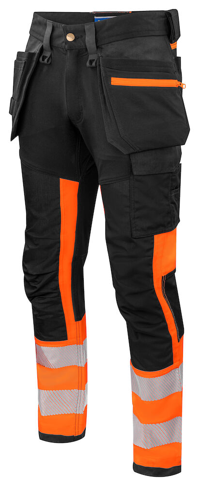 Joustavat työhousut mahdollistavat hyvän liikkuvuuden ja tuntuvat mukavilta päällä. Moderni istuvuus. Tilavat reisitaskut molemmin puolin. Vasemmalla tasku työkaluille ja kynille, puhelintasku, jossa tarrakiinnitys, ja ID-korttipidike. Oikealla mittatasku ja tasku työkaluille, jossa puukkonappi. Muotoillut polvet. Sisäpuolella polvisuojataskut, jotka voidaan säätää kahdelle eri korkeudelle. Heijastavat yksityiskohdat. 3M:n katkoheijastimet.