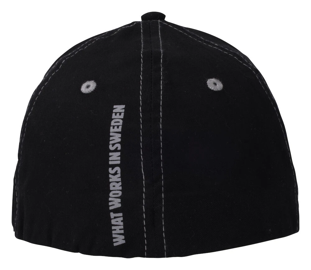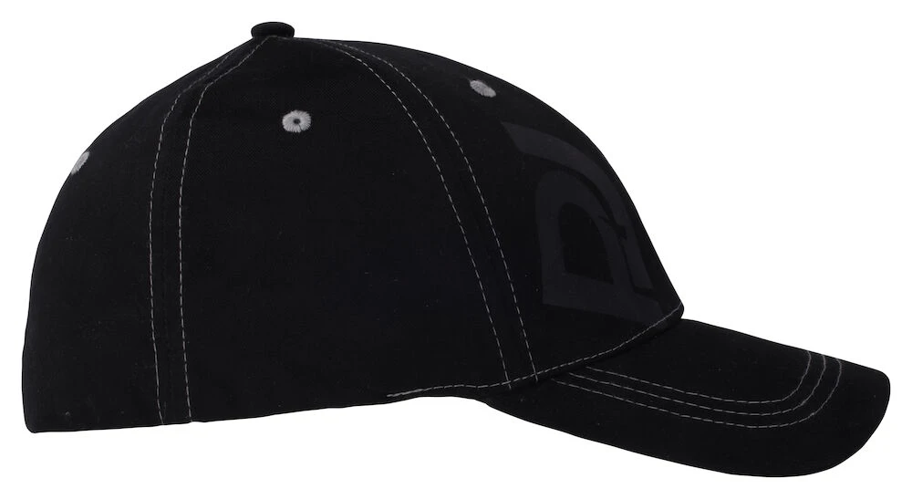 Joustavasta materiaalista valmistettu, logolla varustettu lippalakki.