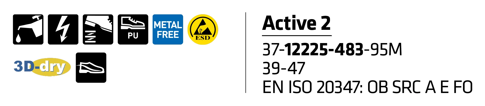 ESD-hyväksytyn Sievi Active 1-2 päällinen on kestävää ja pestävää mikrokuitua. 3D-dry®-vuori siirtää kosteuden pois jalan pinnasta vuorimateriaalin toiseen kerrokseen ja edelleen jalkineen päällisrakenteen kautta pois jalkineesta. Muotoiltu, kokopitkä Sievi Comfort -pohjallinen tuo lisämukavuutta. Pitävä ja tukeva, iskuja vaimentava uudistettu pohja.