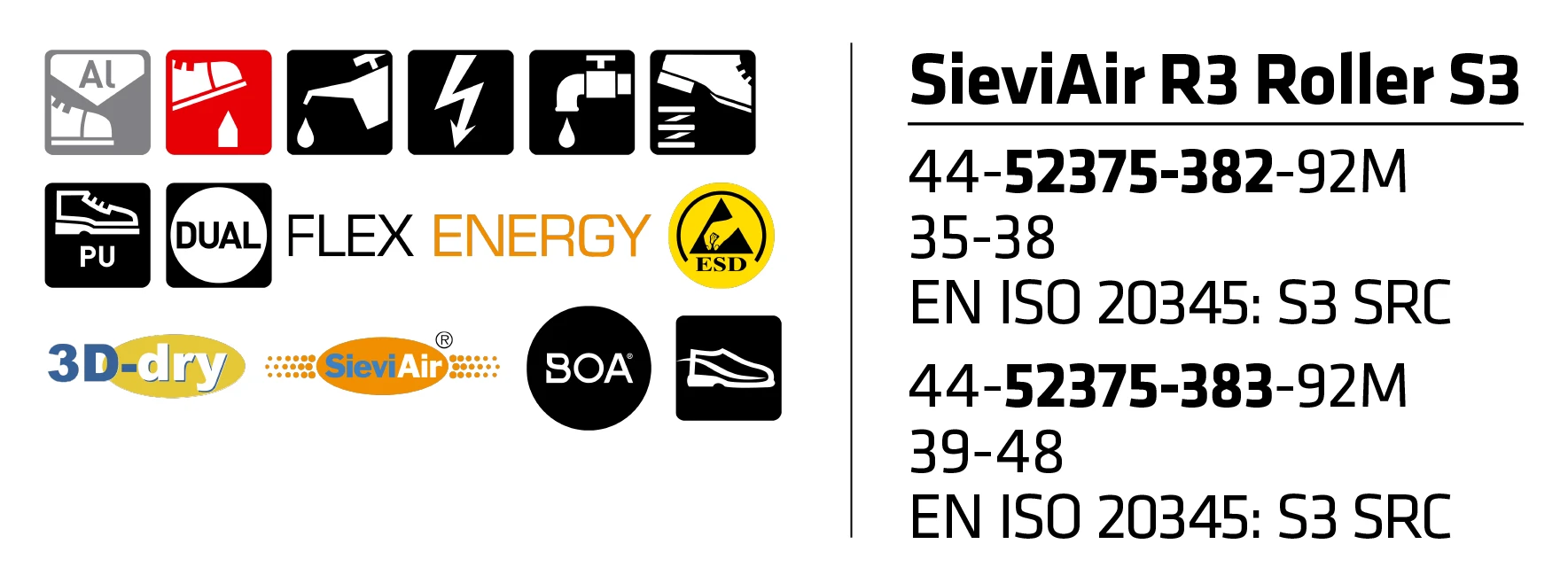 S3-suojaluokan SieviAir®-pohjaratkaisulla oleva Sievi Air R3 Roller S3 Työkenkä BOA®-mekanismilla, teräksisellä naulaanastumissuojalla ja alumiinivarvassuojalla. Maailman kehittynein FlexEnergy-kantavaimennus sitoo syntyvää liike-energiaa ja yli 55 % energiasta palautuu askellukseen. SieviAir®-pohjaratkaisu poistaa jalkojen lämpenemisestä syntyvän kosteuden kengästä pohjan sivussa olevien virtauskanavien kautta.
