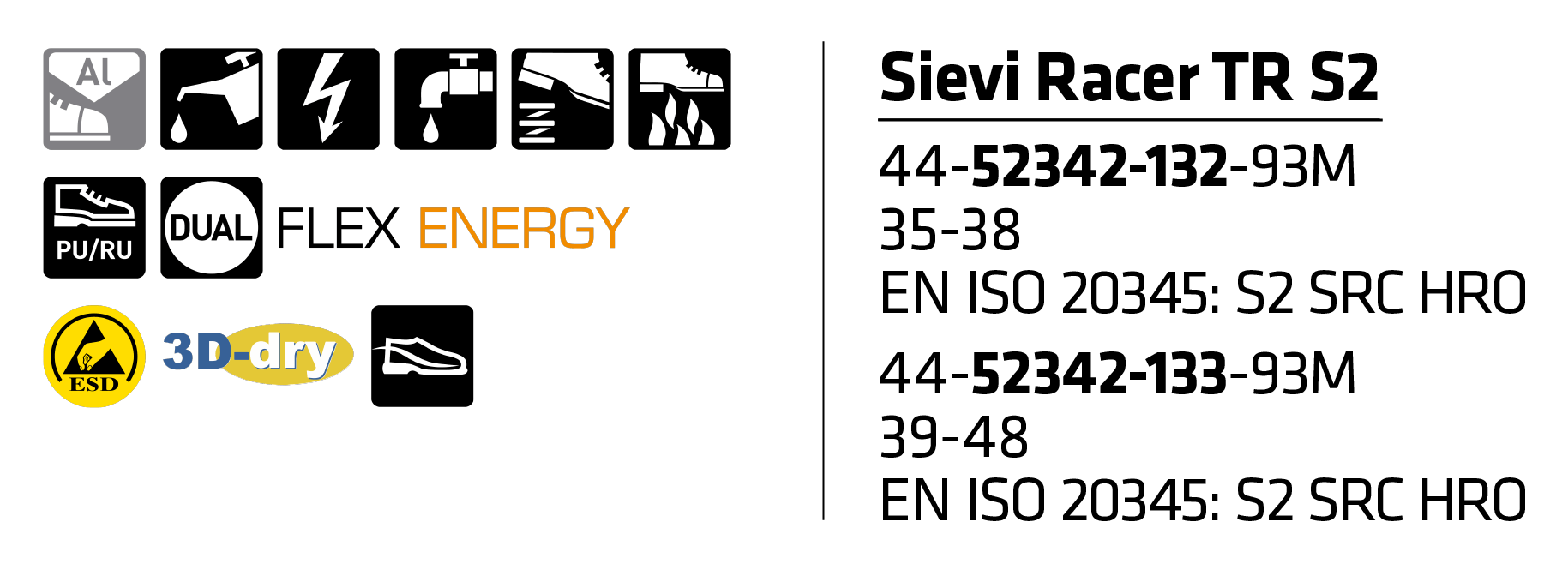 Sievi Racer TR S2 turvalenkkarit ja sen sporttisen kevyt rakenne, hengittävä ja anatomisesti jalkaa tukeva muotoilu sekä pitävä TractionPro-kitkapohja tekee Raceristä ylivoimaisen turvajalkineen. Jalkineessa on alumiininen varvassuoja. FlexEnergy® -joustoelementti sitoo syntyvää liike-energiaa ja yli 55 % energiasta palautuu askellukseesi. Jalkaansopivuus on helppo säätää nauhoilla.