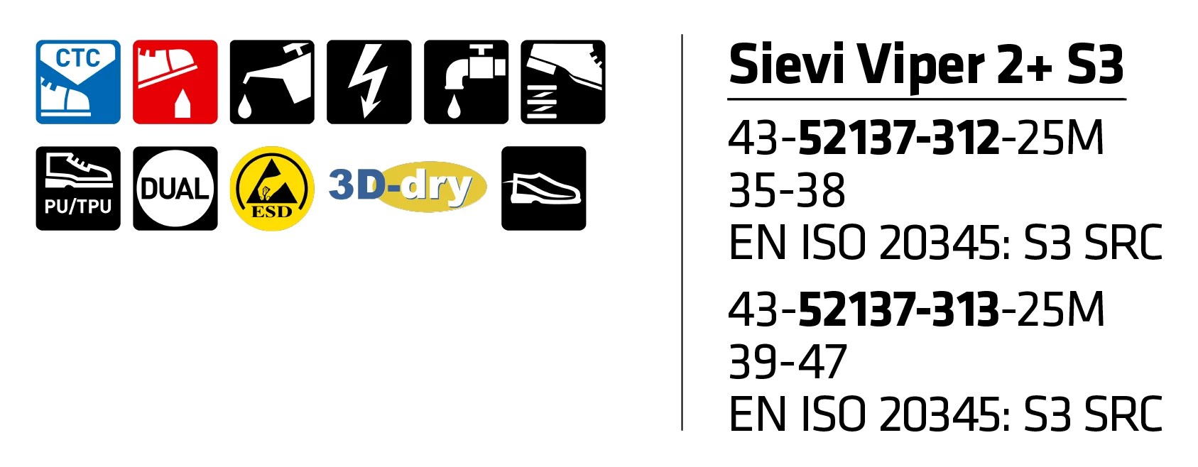 Kestävät ja sporttiset Sievi Viper 2+ S3 puolikengät, jotka on varustettu komposiittivarvassuojalla ja teräksisellä naulaanastumissuojalla. Hengittävyyttä lisää ilmava 3D-dry®-vuori. Kaksikerrospohja antaa parhaan mahdollisen kulutuskestävyyden ja joustourien ansiosta jalkine taipuu optimaalisesti. Erinomaisen iskunvaimennuksen takaa FlexStep®-pohja.